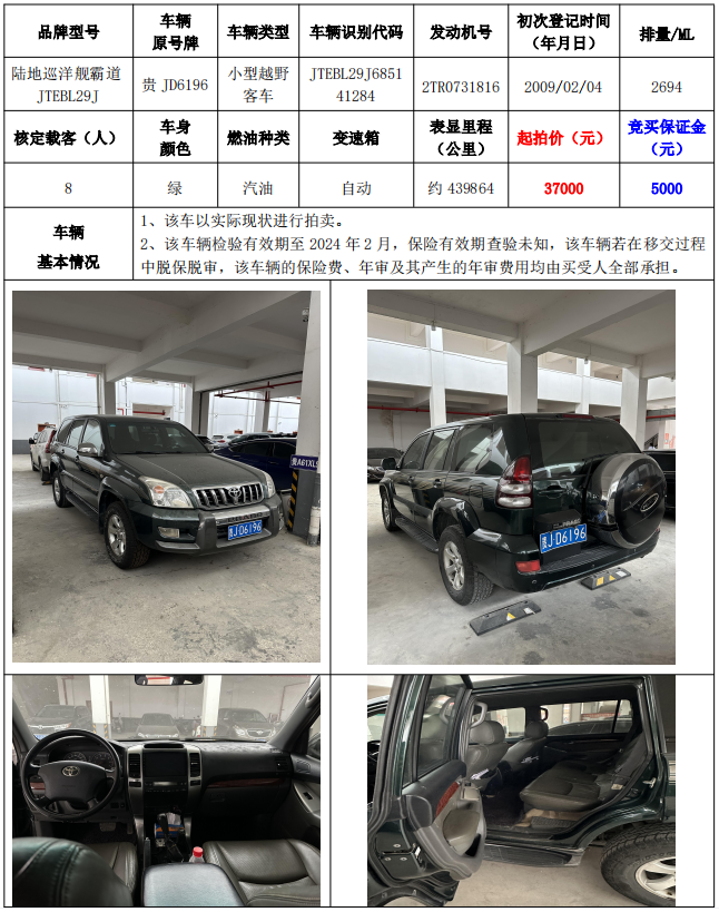 拍品編號1:陸地巡洋艦霸道JTEBL29J小型越野客車1輛(車輛原號牌:貴JD6196)